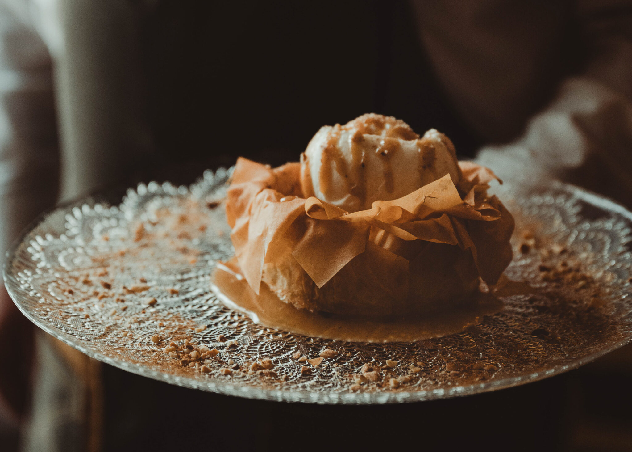 Our recipe at Peskesi comes from the Zaros cultural association’s book. It combines ingredients like crispy dough, rice pilaf cooked in chicken broth, almonds, myzithra cheese, raisins, and cinnamon. It is served hot, with a scoop of cream ice cream and tahini on the side.